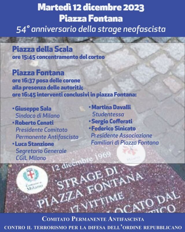 Martedì 12 dicembre, giorno del 54° anniversario della strage di piazza Fontana, Milano commemorerà le vittime della bomba collocata il 12 dicembre 1969, nel salone della Banca Nazionale dell’Agricoltura, dal gruppo terroristico di estrema destra, Ordine Nuovo. Morirono 17 persone e 88 rimasero gravemente ferite. Diversi gli appuntamenti previsti e aperti alla cittadinanza.