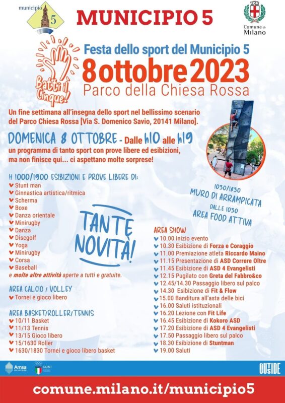 Domenica 8 ottobre dalle 10 alle 19 , il Municipio 5 invita la cittadinanza alla “Festa dello sport” che si terrà nel bellissimo scenario del Parco Chiesa Rossa in via S. Domenico Savio, Milano.