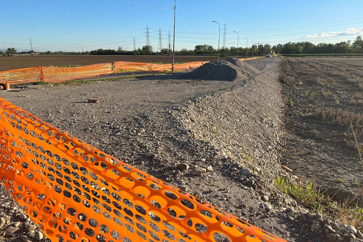 D – Percorso dal nuovo ponte carrabile di via Campazzino verso Cascina Giugno. Il tratto, a margine dei campi agricoli, è in fase di realizzazione ed è stato steso lo strato in terra mista naturale che verrà ultimato con successive rullature.