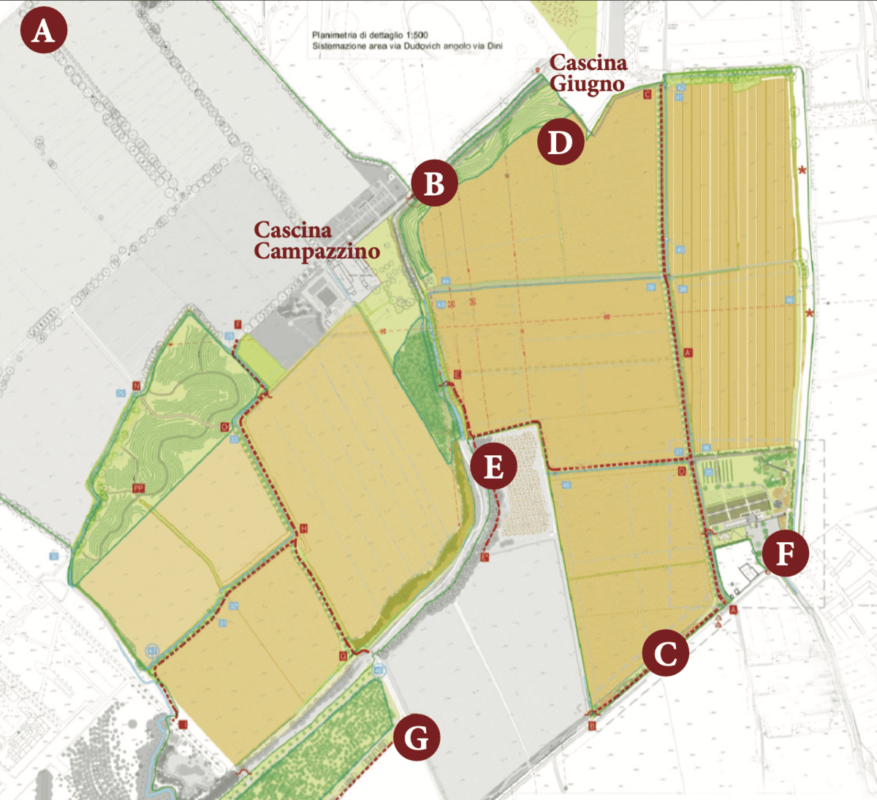 E – Percorso tra lo sbarco dell’attraversamento pedonale sul Ticinello residuo e il percorso realizzato nel primo lotto. Sul tratto in fase di realizzazione, situato tra il margine dei campi agricoli a sud di Cascina Campazzino, è stato steso lo strato in terra mista naturale che verrà ultimato con successive rullature.