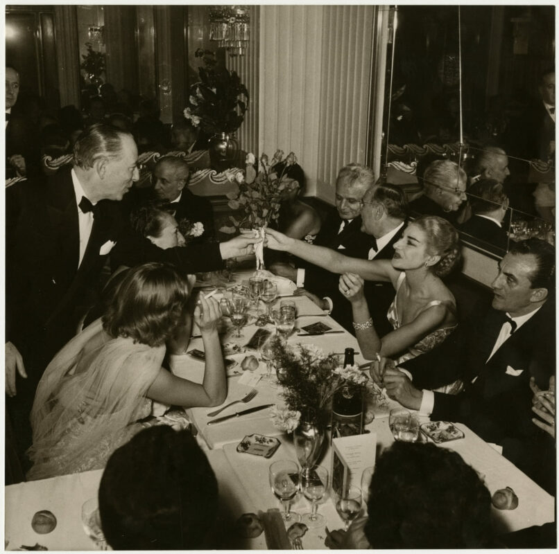 Maria Callas riceve un mazzo di fiori da Valentino Bompiani, al ristorante Savini, la sera della Prima de La Vestale di Gaspare Spontini. Alla sua sinistra il regista Luchino Visconti, a capo tavola il marito Giovanni Battista Meneghini, a sinistra del quale è seduto il soprintendente del Teatro alla Scala Antonio Ghiringhelli, Milano, 1954. Foto Franco Giglio.