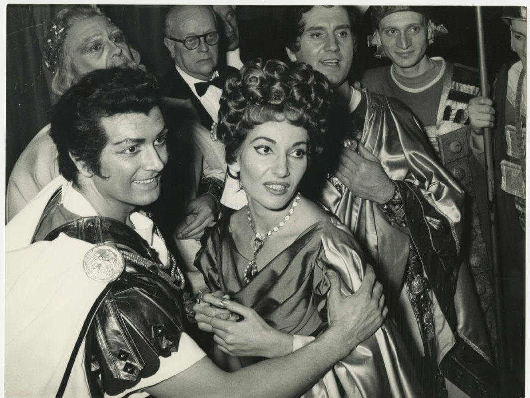 Dietro alle quinte: Franco Corelli e Maria Callas alla prima dell’opera Poliuto di Gaetano Donizetti al Teatro alla Scala; in secondo piano da sinistra Nicola Zaccaria ed Ettore Bastianini, Milano, 7 dicembre 1960.