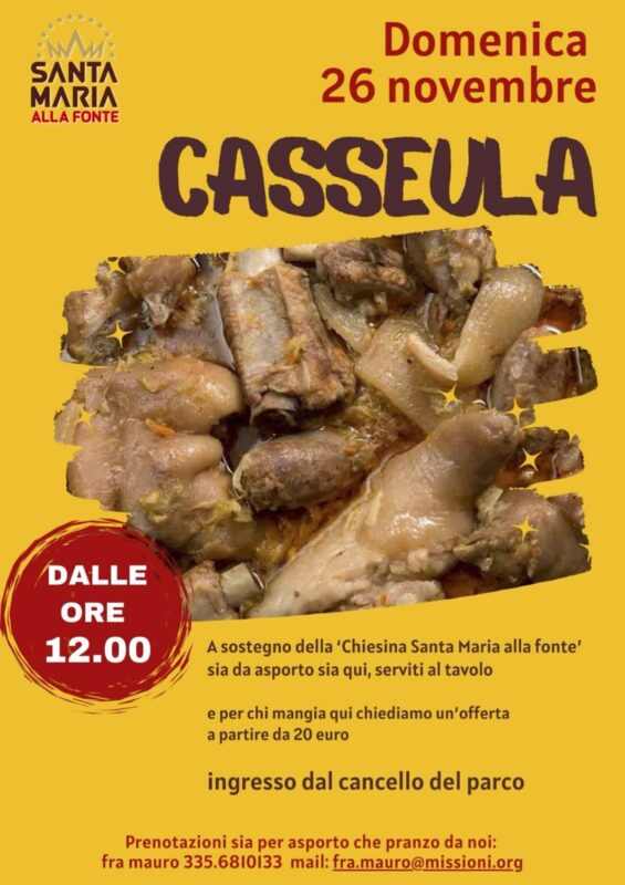 Prima data da non perdere, domenica 26 novembre: dalle ore 12 cassoela da asporto o da consumare in loco. Prenotazioni: fra.mauro@misisoni.org mob. 3356810133.