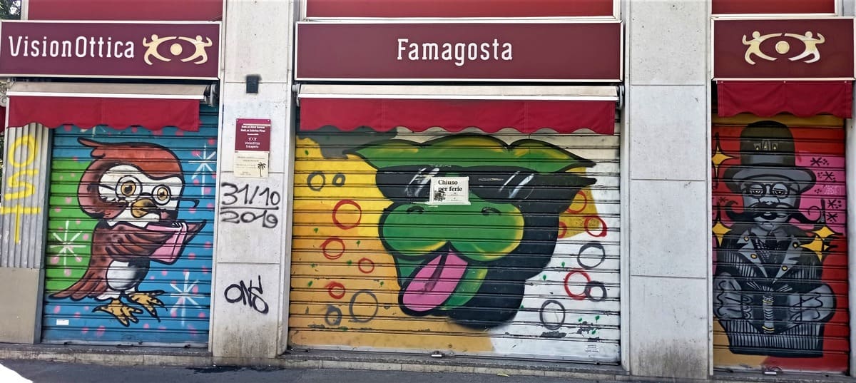 Tuttavia, c’è un fattore che può rallegrare la vista di chi non riesce ad andare in ferie e ad agosto rimane in città. Sono le tante saracinesche dipinte , visibili in pieno giorno nel mese di chiusura della maggior parte dei negozi. Le serrande da alcuni anni vengono dipinte da writers con immagini allegre e spiritose che alleviano la vista di coloro che vi passano davanti. Sono disegnate da giovani che provengono da Brera o altre scuole d’arte, tra cui veri e propri professionisti.