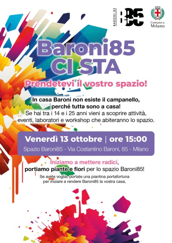 Venerdì 13 ottobre dalle ore 15, apre lo spazio Baroni85 in via Costantino Baroni 85: è la nuova dimora per i giovani tra i 14 e i 25 anni che potranno scoprire attività, eventi, laboratori e workshop da svolgere in questo spazio che diventerà la loro casa.