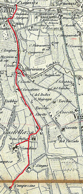 Dopo aver percorso un buon tratto di strada in mezzo alla campagna coltivata, saremmo giunti al borgo di Morivione, dopo una curva a sinistra (attuale via dei Fontanili) saremmo arrivati, come oggi, a Vigentino. Noi poi seguiremo la diramazione verso destra (via Verro).