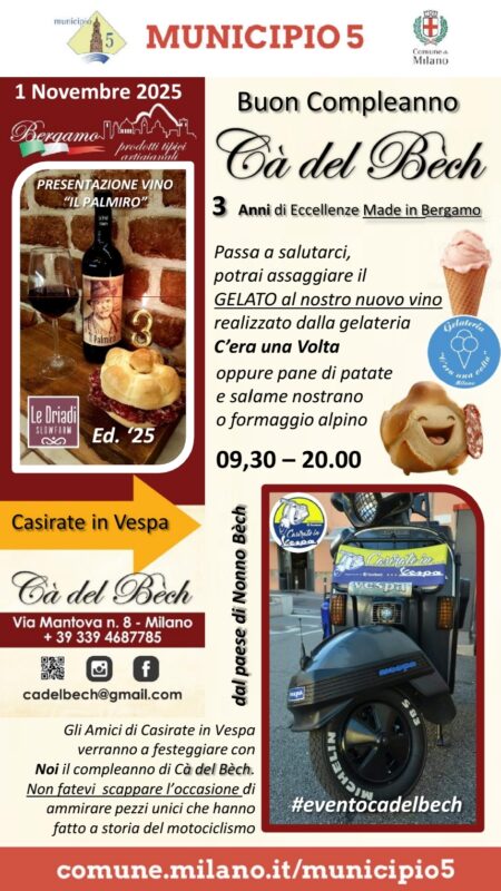 Segnalato per il secondo anno dalla guida Osterie d’Italia di Slow Food – sezione locali quotidiani -, la bottega Ca’ del Bèch offre le specialità delle valli Orobie selezionate da Fabio Colombo, innamorato della sua terra e appassionato di buon cibo: salumi, formaggi, marmellate, farine, vini, birre e molto altro. Per l’anniversario dell’apertura presenta all’assaggio il gelato fatto con il suo vino nuovo, Il Palmiro, pane di patate e salame nostrano. In mostra, le moto d’epoca degli Amici di Casirate in Vespa.
