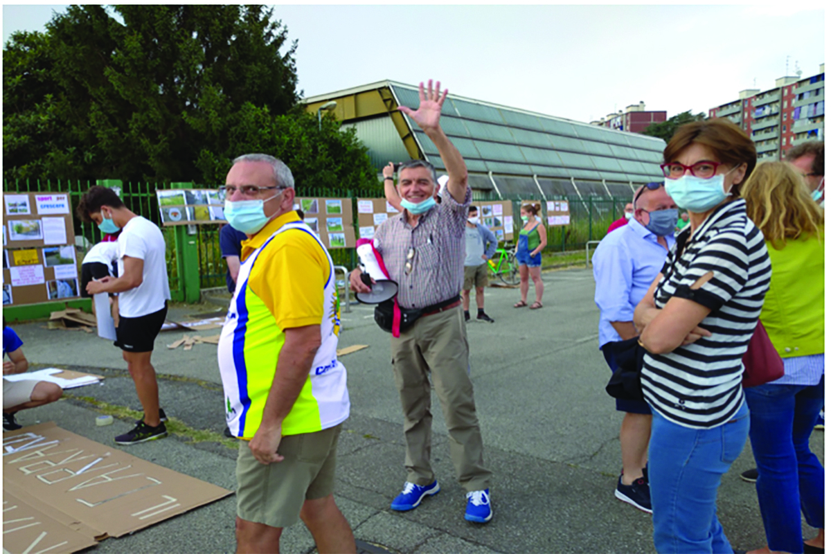 Luglio 2020 – Luciano Bagoli (con il braccio alzato) di fronte al Carraro a una manifestazione per sollecitare l’avvio dei lavori di riqualificazione.