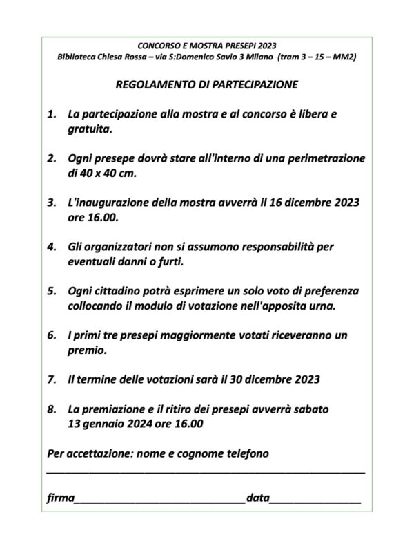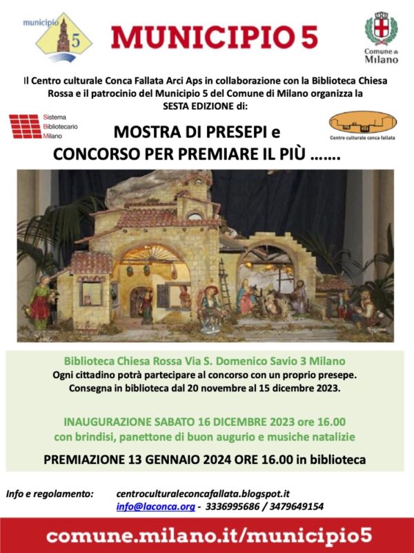 Il Centro culturale Conca Fallata propone la sesta edizione del Concorso e Mostra Presepi per premiare i più caratteristici. L’evento fino allo scorso anno si svolgeva alla Serra Lorenzini, ora chiusa, pertanto si svolgerà nella bella atmosfera della Biblioteca Chiesa Rossa (Via S. Domenico Savio 3 Milano)