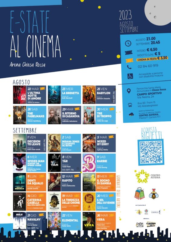 Ritorna il 22 agosto, dopo una breve pausa estiva, la rassegna cinematografica E-state al Cinema: un’estate da passare guardando film di qualità sotto le stelle al Cinema Arena Chiesa Rossa. Saranno 4 film a settimana fino a fine settembre. E per 5 serate a settembre saranno presenti anche ospiti davvero speciali: i registi e i protagonisti dei film.