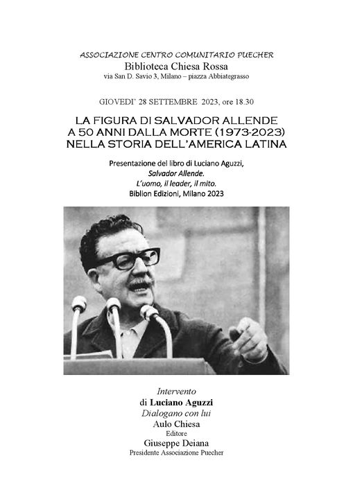 Il giorno precedente, 28 settembre ore 18.30 il Centro Puecher presenta il libro di Luciano Aguzzi, Salvador Allende. L’uomo, il leader, il mito, Biblion Edizioni, Milano 2023. La figura di Salvador Allende a 50 anni dalla morte (1973-2023)nella storia dell’America Latina. Intervento di Luciano Aguzzi. Dialogano con lui Aulo Chiesa, Editore, Giuseppe Deiana, Presidente Associazione Puecher. Dove:
