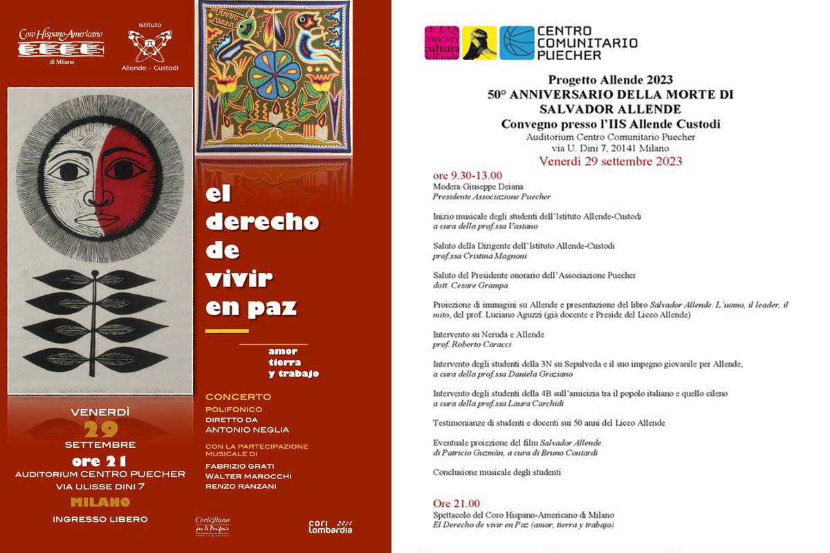 Per ricordare quanto accadde 50 anni fa, il Centro Puecher organizza un incontro il 29 settembre, dalle 9,30 alle 13, presso l’Auditorium Centro Puecher (via Ulisse Dini 7), convegno su Salvador Allende a cinquant’anni dalla sua morte. Alle ore 21: spettacolo del Coro Hispano-Americano di Milano “El Derecho de vivir en Paz (amor, tierra y trabajo), a cura dell’Associazione Puecher e dell’Istituto Allende. Dove: