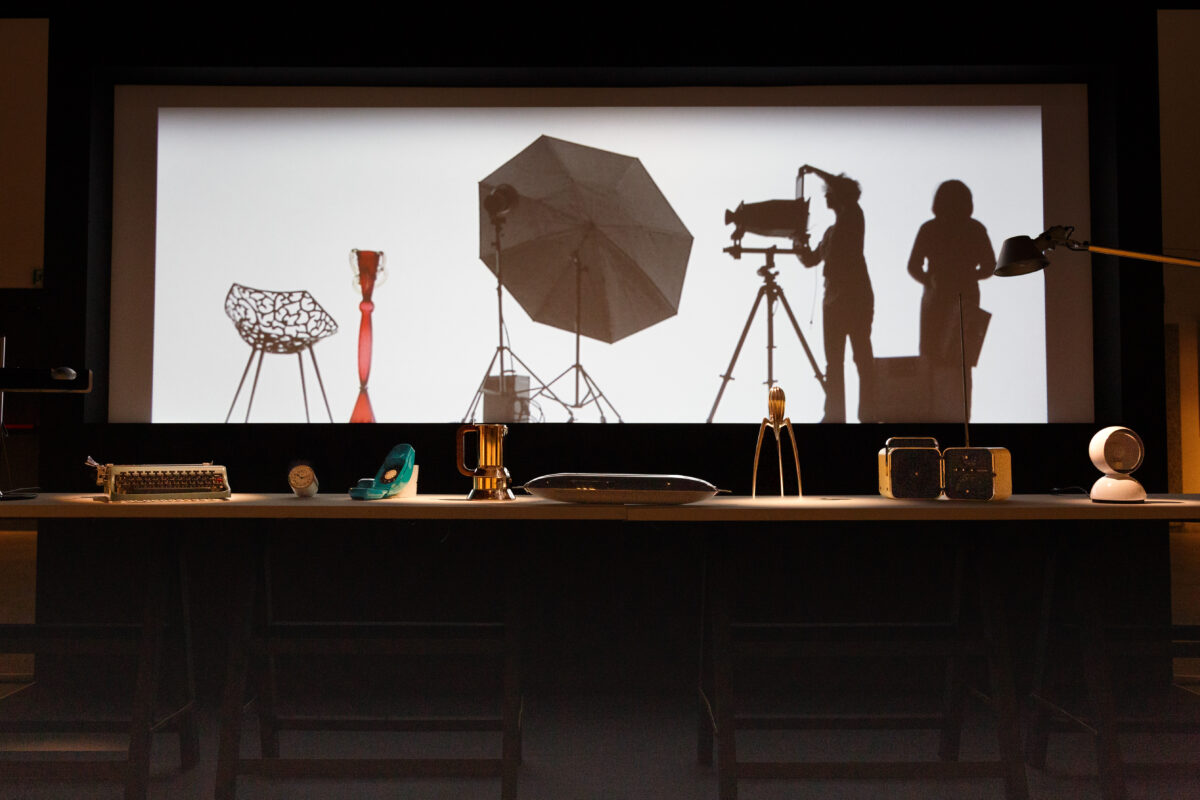 Usando alcune suppellettili dello studio e oggetti di design, sono stati allestiti: una camera oscura simbolizzata dall’ingranditore e da una lampadina rossa; un limbo in miniatura; una sala posa con la grande macchina fotografica a soffietto – il banco ottico – e una luce. Poi, il classico tavolo da falegname per lavorare agli allestimenti, e infine l’archivio con gli armadietti e le scatole gialle delle lastre in bell’ordine. Le varie operazioni che si svolgevano in ciascuna situazione sono state esemplificate da efficacissimi filmati.