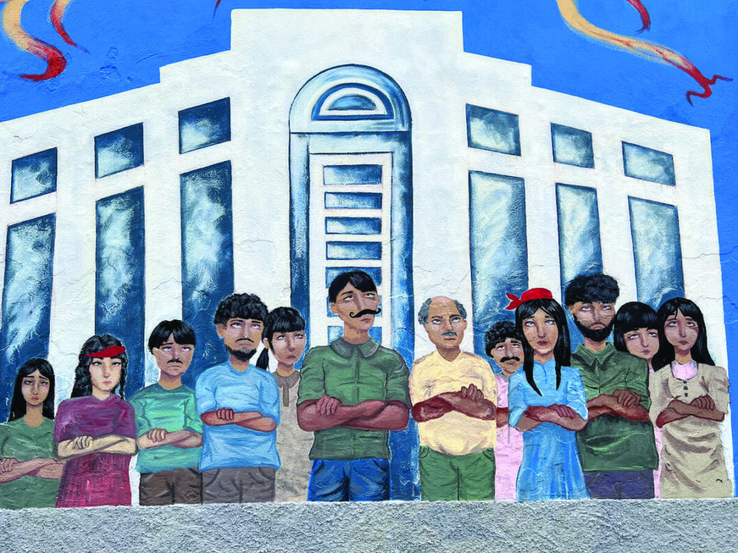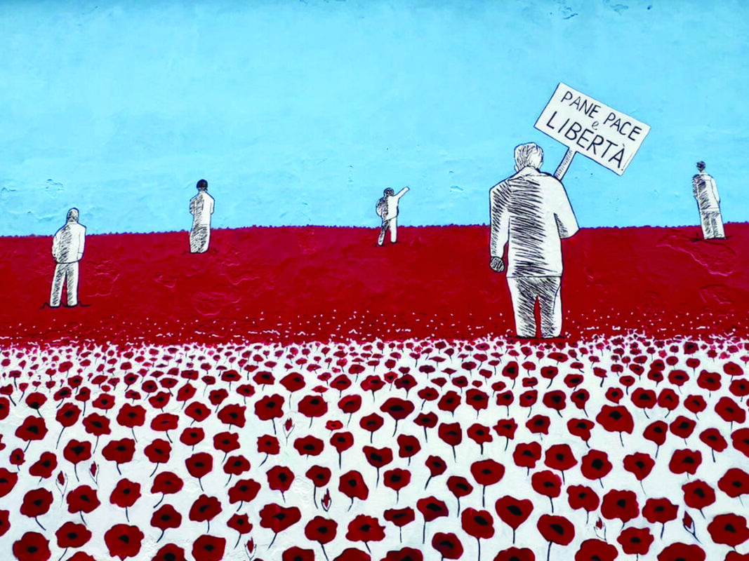 “Campo della libertà”. Metafora del sacrificio dei partigiani, di libertà ma anche di morte. Ciascun papavero rappresenta un uomo caduto che ha lottato per i diritti di tutti. Uno di questi ha un cartello con uno dei motti principali dell’epoca “Pane, pace e libertà”. Murale di: Simone Pascali e Nicole Patruno.