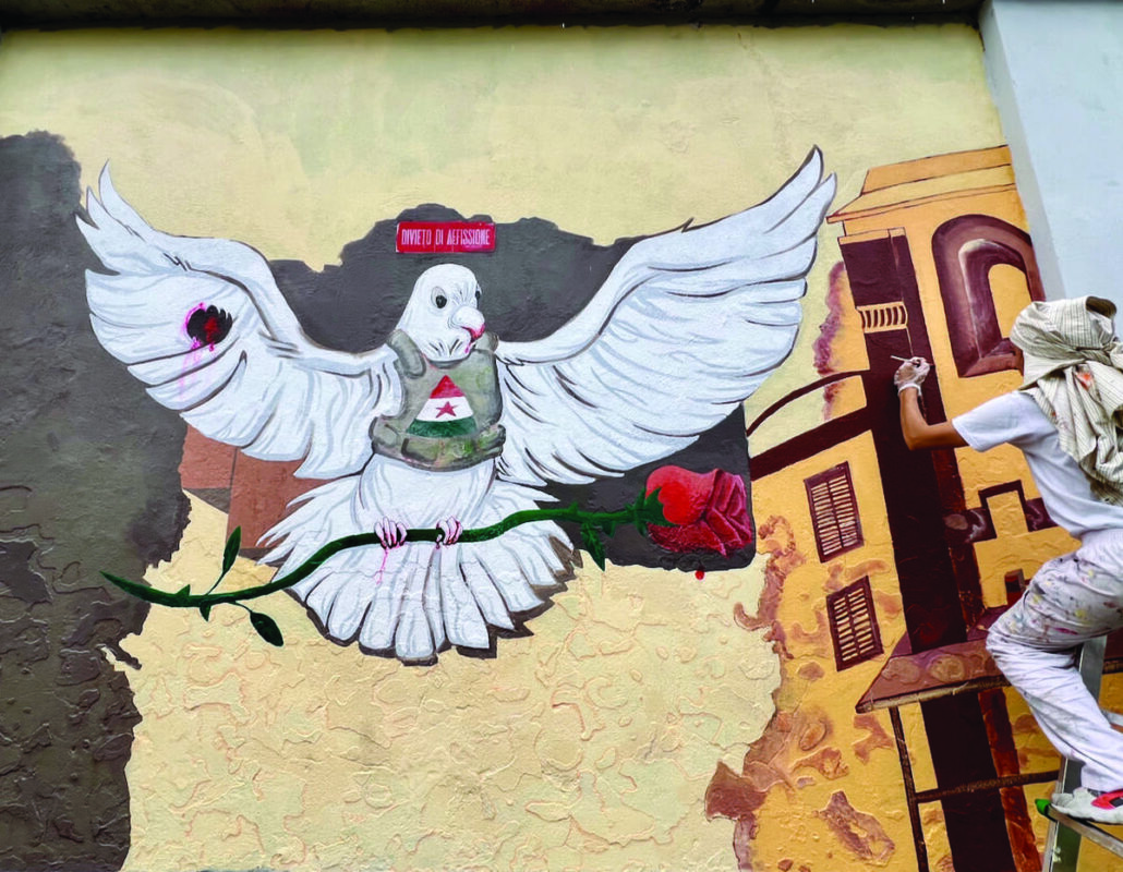“Spiccata della rivalsa”. Una colomba è in volo con un’ala squarciata da una pallottola, con le zampe e il becco sanguinanti. Sul petto spicca il simbolo della Brigata partigiana Garibaldi. La rosa con le spine che tiene fra le zampe rappresenta la lotta contro la guerra e la distruzione delle città. Murale di: Massimiliano Gomes