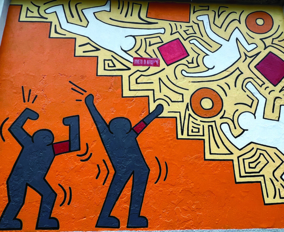 “Sgambetto al nazismo”. Rappresenta gli operai che difendono le fabbriche dai furti di merci e macchinari da parte dei nazisti in fuga dal Nord Italia. Per salvaguardare i beni delle aziende, attuarono uno sciopero davvero singolare: rallentare al massimo le operazioni, anche simulando cadute dalle scale. Murale di: Carlotta Bottini