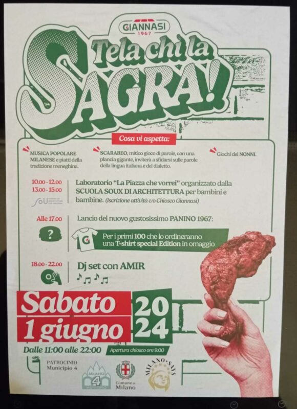 Terza edizione di Te la Chi la sagra, festa all’insegna della tradizione meneghina, organizzata dallo storico chiosco Giannasi il 1° giugno prossimo, dalle ore 9 alle 22. Il tema di quest’anno è la milanesità, l’orgoglio delle tradizioni e il dialetto. Quindi musica popolare nata sotto la Madonnina, scarabeo con possibilità di usare termini della lingua del Porta e confronto tra modi di dure dei giovani d’oggi e dei giovani dei Bei temp indreé.