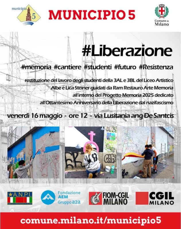 A conclusione delle iniziative realizzate sul territorio, da marzo a maggio, per celebrare l’80º Anniversario della Liberazione dal nazifascismo, gli studenti del Liceo Artistico multimediale Albe e Lica Steiner (classi 3AL e 3BL) restituiscono alla città un’opera collettiva nata nel segno della memoria, della Resistenza e del futuro: un nuovo “Murales della Memoria 2025” presso i muri perimetrali della centrale elettrica di viale Lusitania.