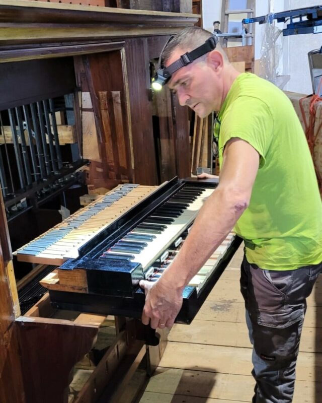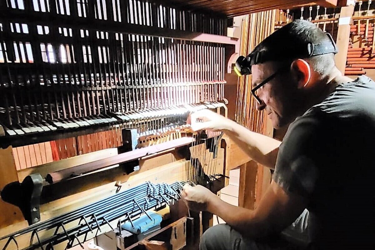 Don Giampiero e i restauratori della Bottega Organaria Soncino, Cremonesi Ugo e D’Arpino Claudio