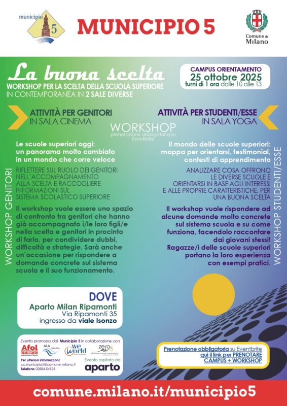 Scegliere la scuola superiore Ăš una tappa fondamentale nel percorso di crescita di ogni studente e studentessa. Per accompagnare famiglie e ragazzi in questo momento delicato, il Municipio 5 di Milano organizza anche questâanno âLa buona scelta – Campus di Orientamento 2025â, unâiniziativa che unisce formazione, informazione e confronto diretto con le scuole del territorio.