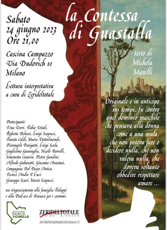 Sabato 24 giugno, ore 21, una serata teatrale nel fresco della Cascina Campazzo, all’interno del Parco Ticinello, ispirato alla storia della Contessa di Guastalla, promossa dalla compagnia teatrale Zerideltotale e Teatro Binasco con una lettura interpretativa de la Contessa di Guastalla, testo di Michela Marelli.