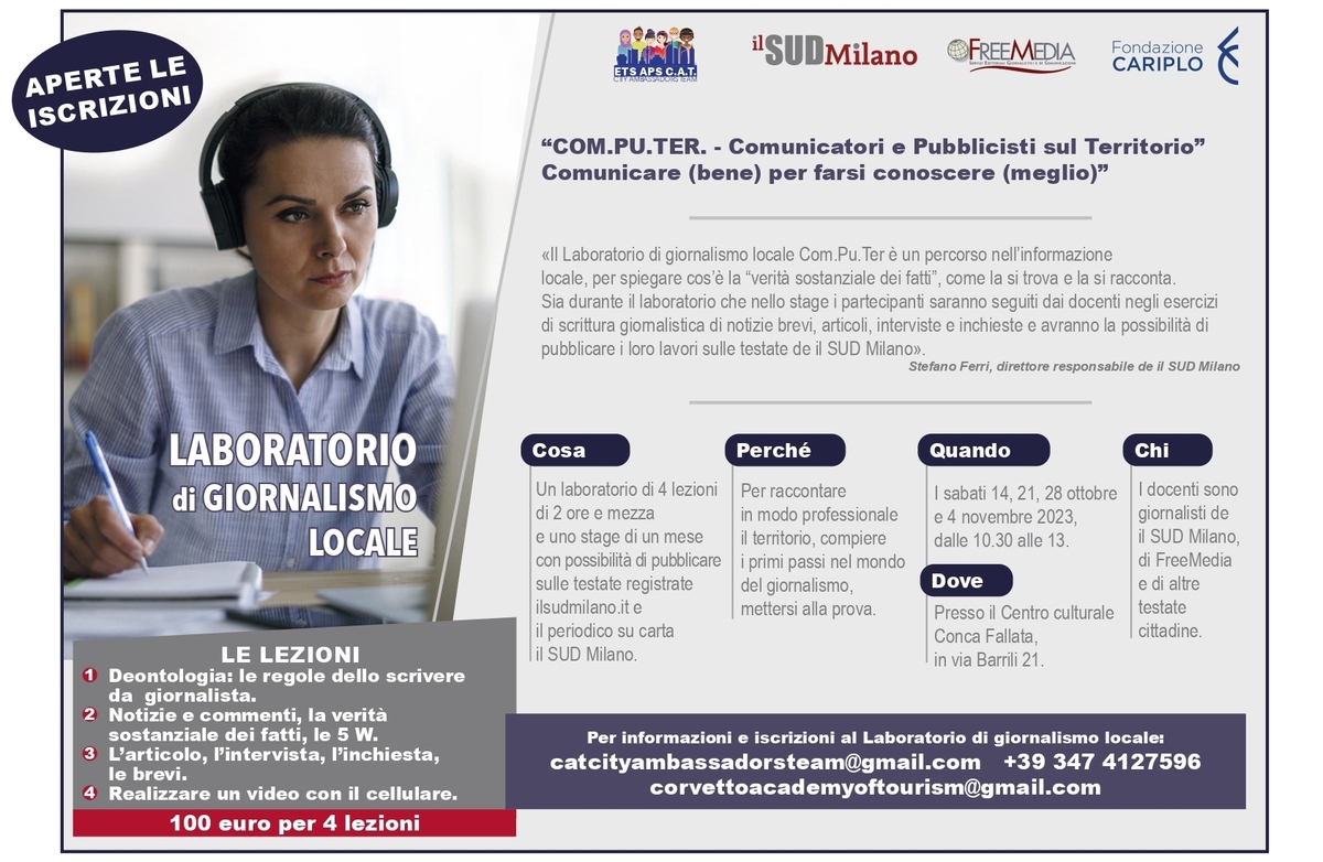 Dal 14 ottobre per quattro sabati di fila, dalle ore 10,30 alle 13, il giornale il SUD Milano e l’associazione Cat (City Ambassador Team) organizzano Com.pu.ter – Comunicatori e Pubblicisti del territorio, il primo Laboratorio di giornalismo locale. L’iniziativa si rivolge a coloro che sono interessati ad apprendere i rudimenti del giornalismo, in particolare quello locale.
