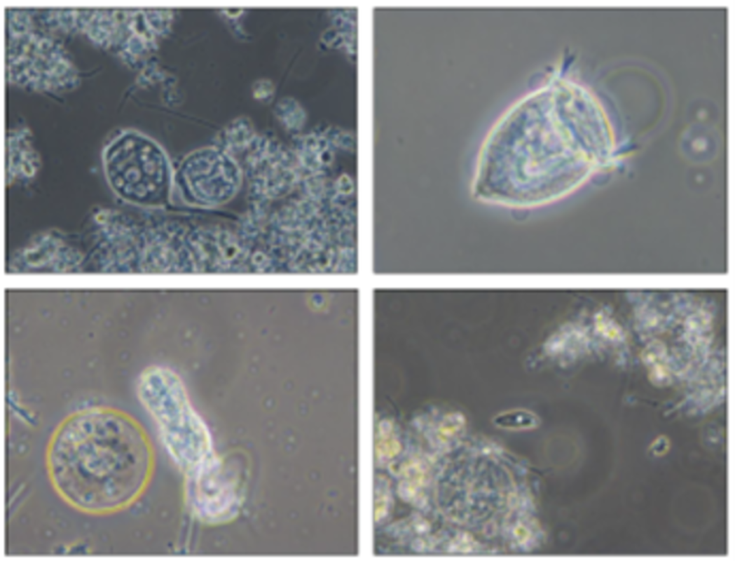 Sono così piccoli che la luce gli passa attraverso e possiamo osservare il cibo che hanno mangiato; a volte è colorato, se per esempio si tratta di alghe verdi. Questi della foto sono protozoi, più grandi dei batteri decompositori, ma anche loro sono presenti nelle vasche perché si nutrono dei batteri e contribuiscono all’equilibrio delle popolazioni presenti in vasca.