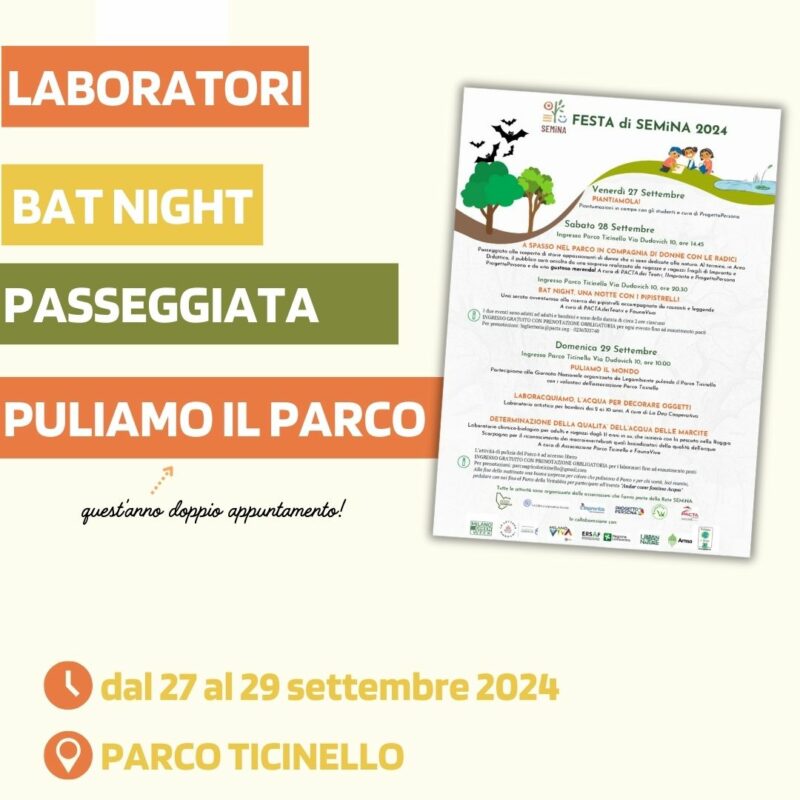 Sabato 21 settembre come da tradizione l’associazione Parco Ticinello partecipa all’iniziativa di @legambiente per pulire il Parco agricolo urbano Ticinello. Il ritrovo è in cascina Campazzo alle ore 9:30. Quest’anno (in un impeto di entusiasmo, dicono i volontari dell’associazione) chi è desideroso di pulire il parco ma non può essere presente in questa data, può partecipare a una pulizia straordinaria la domenica successiva 29/9 alle ore 10, nell’ambito della Festa di SEMiNA