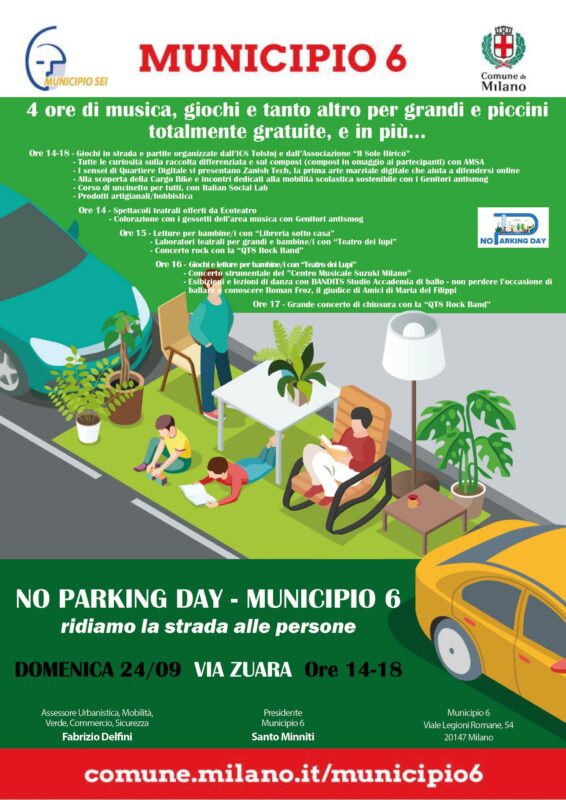 Domenica 24 settembre i Municipi 5 e 6 partecipano all’iniziativa del Comune di Milano “No Parking Day”. Una giornata in cui un tratto di asfalto o una via si trasformerà in un’aiuola, un luogo per leggere, per giocare, uno spazio per incontrarsi… Il Milano No Parking Day è l’evento in cui si potranno immaginare e disegnare le strade di Milano senza lo scorrere incessante e roboante del traffico ma occupate solo dalle persone che girano a piedi, in bici, in gruppo o ferme ad ascoltare o partecipare a un evento.