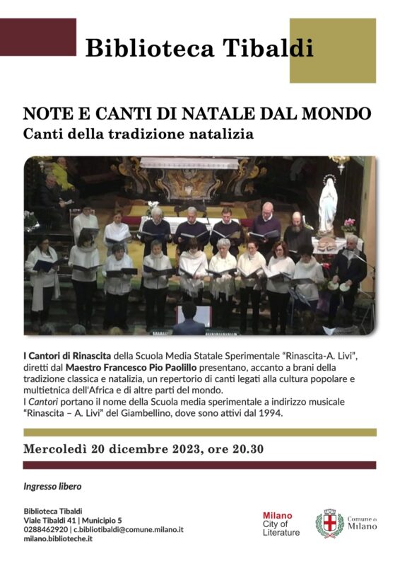«Note e canti di Natale dal mondo» è il titolo dell’intensa serata con i Cantori di Rinascita che si esibiscono alle 20.30 di mercoledì 20 dicembre nella Biblioteca Tibaldi, presso la sede del Municipio 5, a ingresso libero. In programma canti della tradizione natalizia