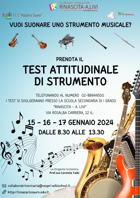 Prenotare il test attitudinale di strumento telefonando alla Scuola media sperimentale a indirizzo musicale “Rinascita“: tel. 0288444500 vespri.wikischool.it
