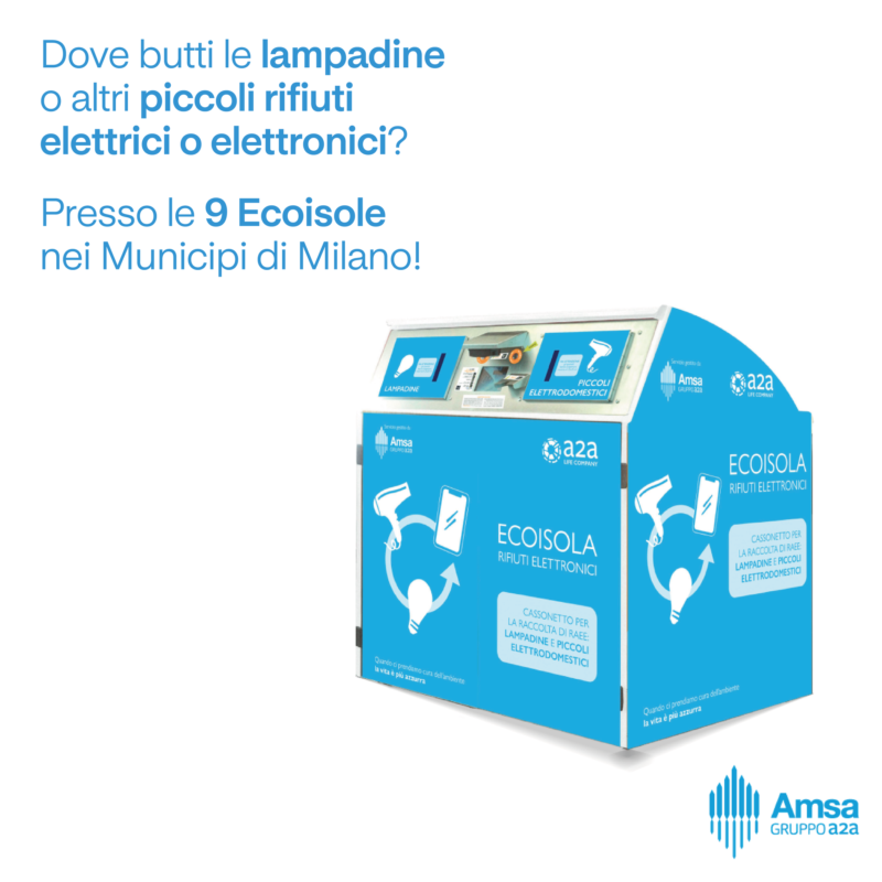 Lampade e piccoli rifiuti elettronici possono essere inoltre conferiti nelle Ecoisole presenti in 9 punti nei diversi municipi di Milano e in alcuni punti vendita della grande distribuzione, dove è possibile trovare anche i contenitori per la raccolta degli oli esausti.