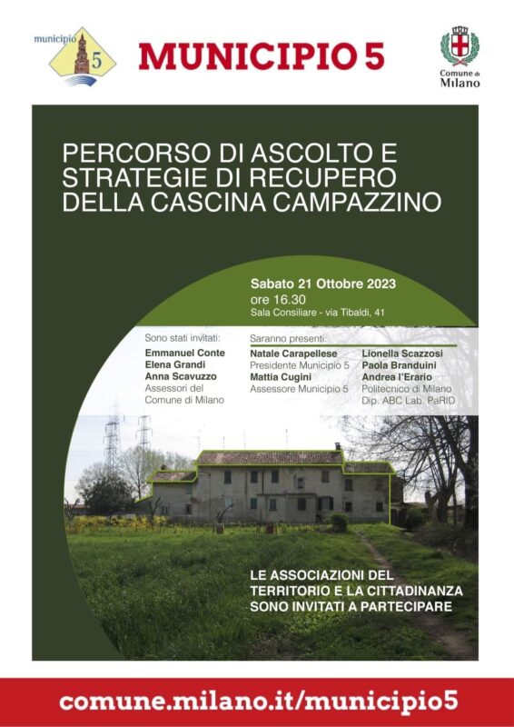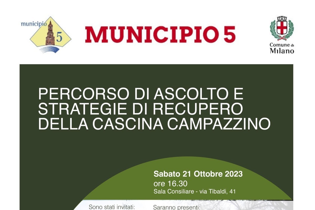 Il prossimo 21 ottobre è stato quindi organizzato dal Municipio 5 un primo incontro per dare vita a un percorso di ascolto e a strategie di recupero della Cascina Campazzino, con la partecipazione degli assessori comunali competenti, il Politecnico di Milano, cittadini e associazioni del territorio.