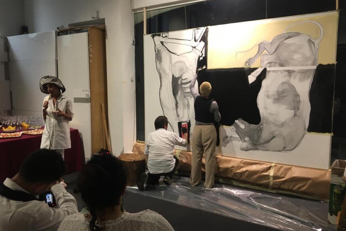 Durante il live painting Massimo Faccini trasforma la grande tela bianca (tre metri per due) in una arena dove l’ artista si esibisce nell’azione pittorica davanti al pubblico che ha modo così di partecipare e seguire il processo creativo dell’artista. In principio, è la gestualità del carboncino nero che traccia linee stilizzate sul bianco della tela, poi nelle penellate vibranti e sicure, sugggerite da gesti impulsivi e ordinati insieme, muovendosi a destra e sinistra, di sopra e in basso alla tela, in un crescendo cromatico con un senso di partecipazione emozionale alla fisica irruenza della figura taurina che lentamente affiora. E all’improvviso eccola balzare fuori dalla tela.