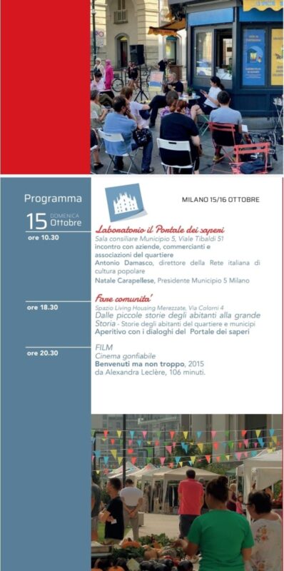 Domani, domenica 15 ottobre, alle 10.30 apre il laboratorio “Portale dei Saperi”, iniziativa promossa dal Municipio 5 “presso la sala consiliare in via Tibaldi, 41. L’iniziativa prosegue poi alle ore 18.30 con “Fare Comunità” in via Colorni, 4 presso lo Spazio Living House Merezzate (Municipio 4).