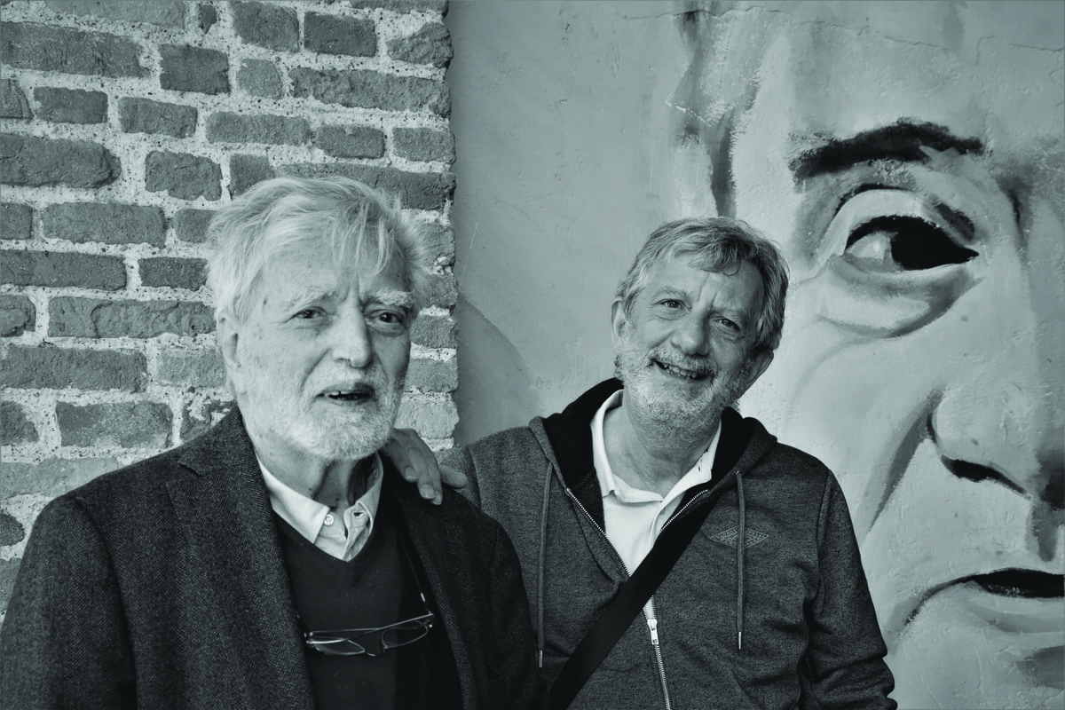 Vittore Vezzoli (a sinistra) e Guglielmo Landi. Dietro di loro uno scorcio del ritratto del giornalista Franco Bomprezzi, dipinto sul portico della Biblioteca Chiesa Rossa.