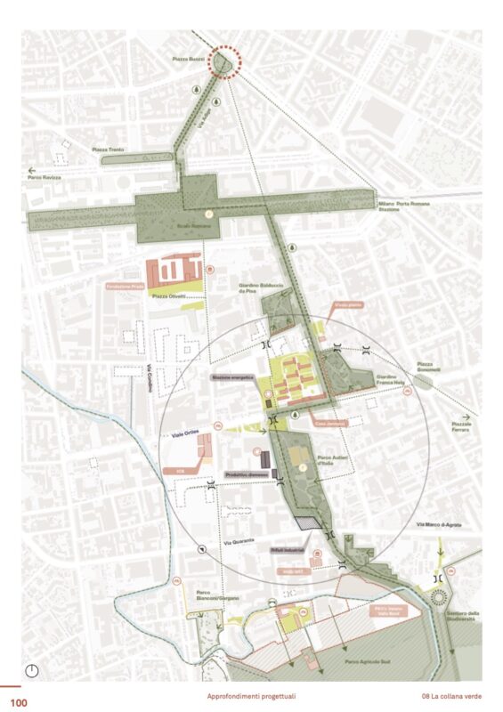 5. Via Antonini, via Quaranta e via Marco d’Agrate si rigenerano – L’asse stradale est-ovest composto da queste tre vie può essere riqualificato nei suoi nodi principali, nei pressi dell’isolato Symbiosis su via Quaranta, tra le vie Gargano e Broni, dove è in costruzione la nuova sede di Moncler e in piazza Chiaradia, all’inizio di via Antonini. Qui è possibile creare un sistema di connessioni per il verde e il tempo libero, di percorsi casa-scuola sicuri, potenziando gli attraversamenti.