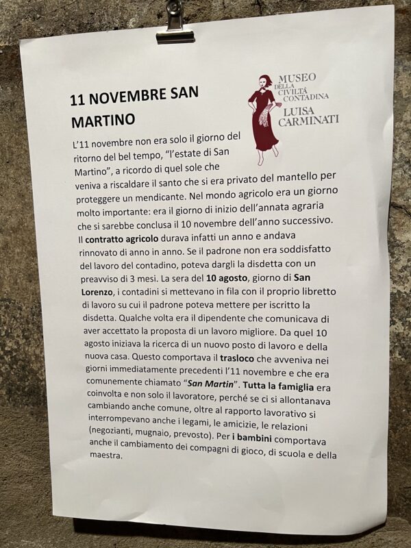“L’11 novembre non era solo il giorno del ritorno del bel tempo, “l’estate di San Martino”, a ricordo di quel sole che veniva a riscaldare il santo che si era privato del mantello per proteggere un mendicante. Nel mondo agricolo era un giorno molto importante: era il giorno di inizio dell’annata agraria che si sarebbe conclusa il 10 novembre dell’anno successivo. Il contratto agricolo durava infatti un anno e andava rinnovato di anno in anno. Se il padrone non era soddisfatto del lavoro del contadino, poteva dargli la disdetta con un preavviso di 3 mesi. La sera del 10 agosto, giorno di San Lorenzo, i contadini si mettevano in fila con il proprio libretto di lavoro su cui il padrone poteva mettere per iscritto la disdetta.”