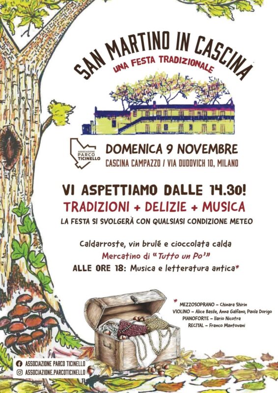 La Festa di San Martino è un momento per ritrovarsi, gustare i frutti dell’autunno e ricordare le tradizioni della vita contadina. Ogni anno l’Associazione Parco Ticinello organizza per gli appassionati della natura e del Parco la tradizionale Festa di “San Martino in Cascina”, per tramandare la vita, la cultura e il passato delle cascine ancora attive che circondano Milano. Non mancheranno per riscaldarsi caldarroste, vin brulè e cioccolata calda, tra profumi, musica e tante attività per grandi e piccoli.