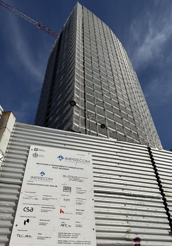 Torre Seta. Restauro e risanamento conservativo post incendio. La riprogettazione architettonica è affidata allo Studio Marco Piva. Grazie a specialisti di settore sono stati individuati i materiali: il nastro di seta che avvolgerà l’edificio sarà in acciaio, alluminio e vetro, che hanno un’ottima resistenza al fuoco e sono interamente riciclabili. Per le facciate interne è riproposta la lana minerale che già aveva contrastato la diffusione dell’incendio dentro gli appartamenti.