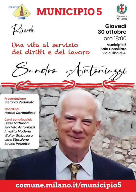 Sandro Antoniazzi, figura storica del sindacalismo milanese, sempre presente nella storia della nostra città e nei quartieri del Municipio 5, verrà ricordato giovedì 30 ottobre alle ore 18.00 nella Sala Consiliare del Municipio 5, in via Tibaldi.