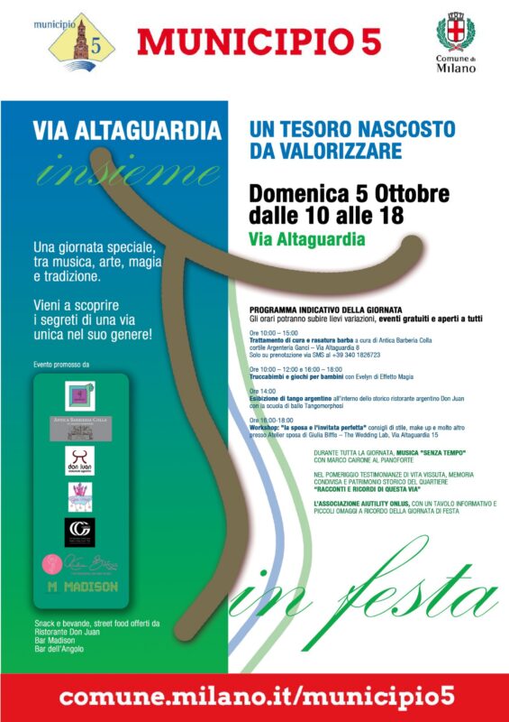 Domenica 5 ottobre, dalle 10 alle 18, debutta la prima Festa di via Altaguardia, la piccola via, nascosta e silenziosa, appena dietro Porta Romana. Da un’idea del ristorante argentino Don Juan e di Ganci Argenterie, per un giorno i riflettori si puntano su quest’angolo affascinante di Milano, poco conosciuto, ma ricco di storia, tradizione, vita quotidiana e tante vivaci realtà, aperte al pubblico per la giornata.